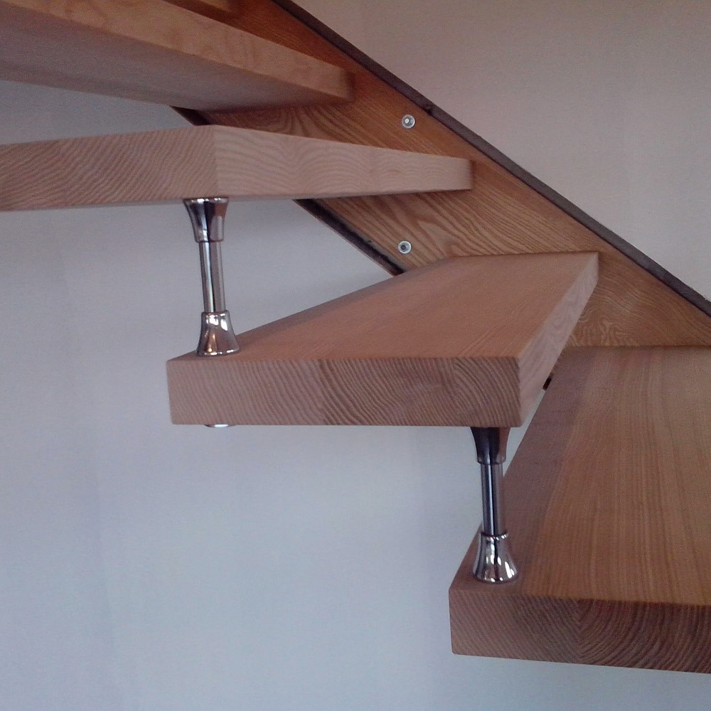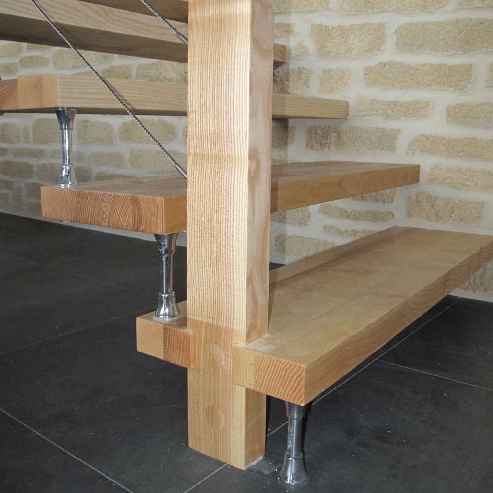 Escalier bois moderne suspendu, sans limon sans contre marche, avec entretoise. Ce type d’escalier avec rampe en câble inox est très contemporain, la technique des entretoises qui permet de supprimer le limon donne une belle légèreté à l’escalier, tout en étant très solide. Le limon contre le mur a été caché dans l’isolation.
